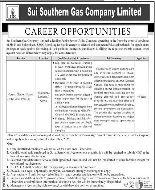 Sui Southern Gas Company Limited SSGC Hyderabad Job 2025 announce the Contract career opportunities for the post of See Below Ad in Sindh, Hyderabad for the fresh and experienced candidates on Contract basis who have Check Advertisement degree. Posted date of this post is 30/11/2025 and the last date is 15/12/2025. if you are eligible for this job apply before due date.