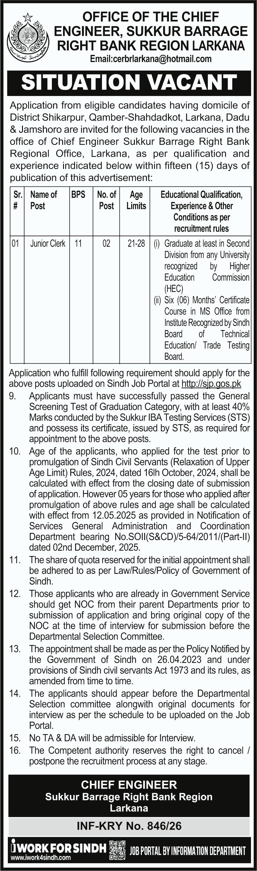Sukkur Barrage Right Bank Region Larkana Jobs 2026 announce the Contract career opportunities for the post of See Below Ad in Sindh, Larkana for the fresh and experienced candidates on Contract basis who have Check Advertisement degree. Posted date of this post is 03/03/2026 and the last date is 17/03/2026. if you are eligible for this job apply before due date.