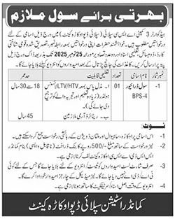Applications are required for the following posts in 3 Company, A.S.C Supply (Supply Depot Okara Cantt). Interested candidates should send their applications along with their CNIC, educational certificates, and two passport-sized photographs to the following address by 25 November 2025. After scrutiny of the documents, candidates will be called for an interview.