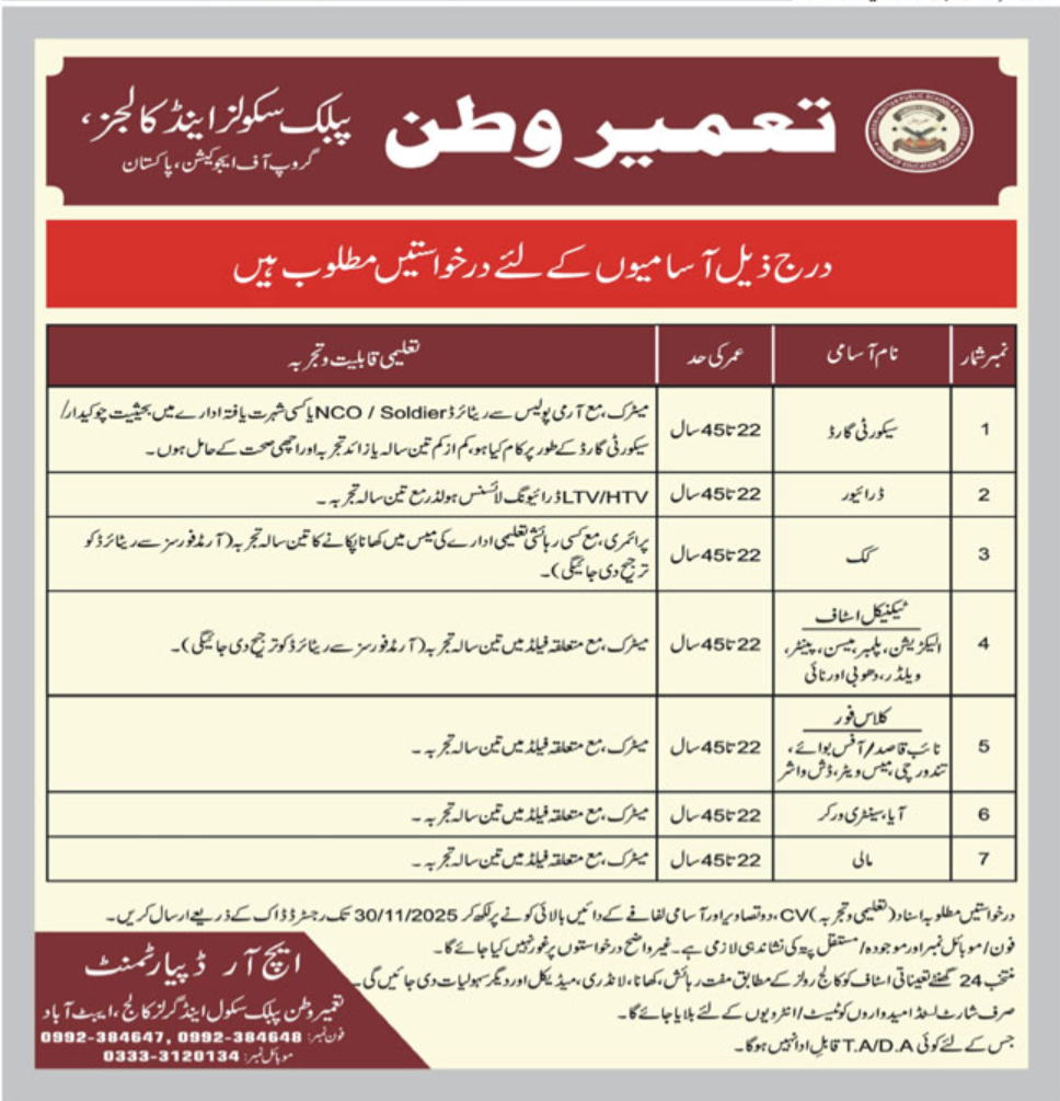 Tameer E Watan Public School & Colleges Abbottabad Jobs 2025 announce the Contract career opportunities for the post of See Below Ad in Khyber Pakhtunkhwa, Abbottabad for the fresh and experienced candidates on Contract basis who have Check Advertisement degree. Posted date of this post is 18/11/2025 and the last date is 30/11/2025. if you are eligible for this job apply before due date.