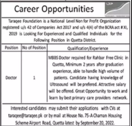Taraqee Foundation Quetta Jobs 2022 announce the Contract career opportunities for the post of See Below Ad in Balochistan, Quetta for the fresh and experienced candidates on Contract basis who have Check Advertisement degree. Posted date of this post is 16/09/2022 and the last date is 20/09/2022. if you are eligible for this job apply before due date.