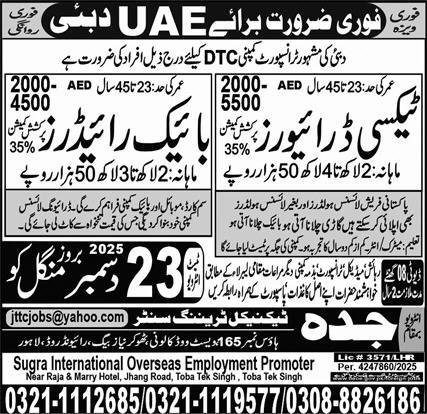 Taxi Driver And Bike Rider Jobs In Saudia Arabia 2025 announce the Contract career opportunities for the post of See Below Ad in Saudi Arabia for the fresh and experienced candidates on Contract basis who have Check Advertisement degree. Posted date of this post is 21/12/2025 and the last date is 23/12/2025. if you are eligible for this job apply before due date.