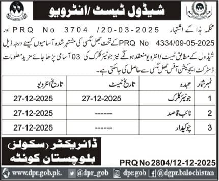 The test/interview for the advertised posts of Jhal Magsi under this department's advertisement PRQ No. 3704/20-03-2025 and PRQ No. 4334/09-05-2025 will be held according to the following schedule. Also, read 03 posts for Junior Clerk. Further information can be obtained from the District Education Office Jhal Magsi.