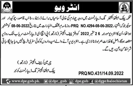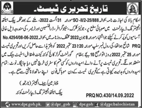 Test interview in Public Health Engineering PHE Balochistan announce the Contract career opportunities for the post of See Below Ad in Balochistan, Quetta for the fresh and experienced candidates on Contract basis who have Check Advertisement degree. Posted date of this post is 15/09/2022 and the last date is 26/09/2022. if you are eligible for this job apply before due date.