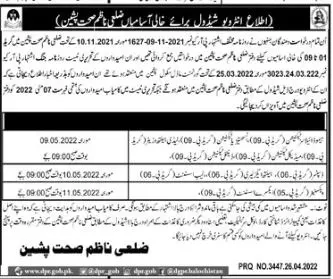 Test Interview Scheduled Health Department Pishin announce the Contract career opportunities for the post of See Below Ad in Balochistan, Pishin for the fresh and experienced candidates on Contract basis who have Check Advertisement degree. Posted date of this post is 27/04/2022 and the last date is 11/05/2022. if you are eligible for this job apply before due date.
