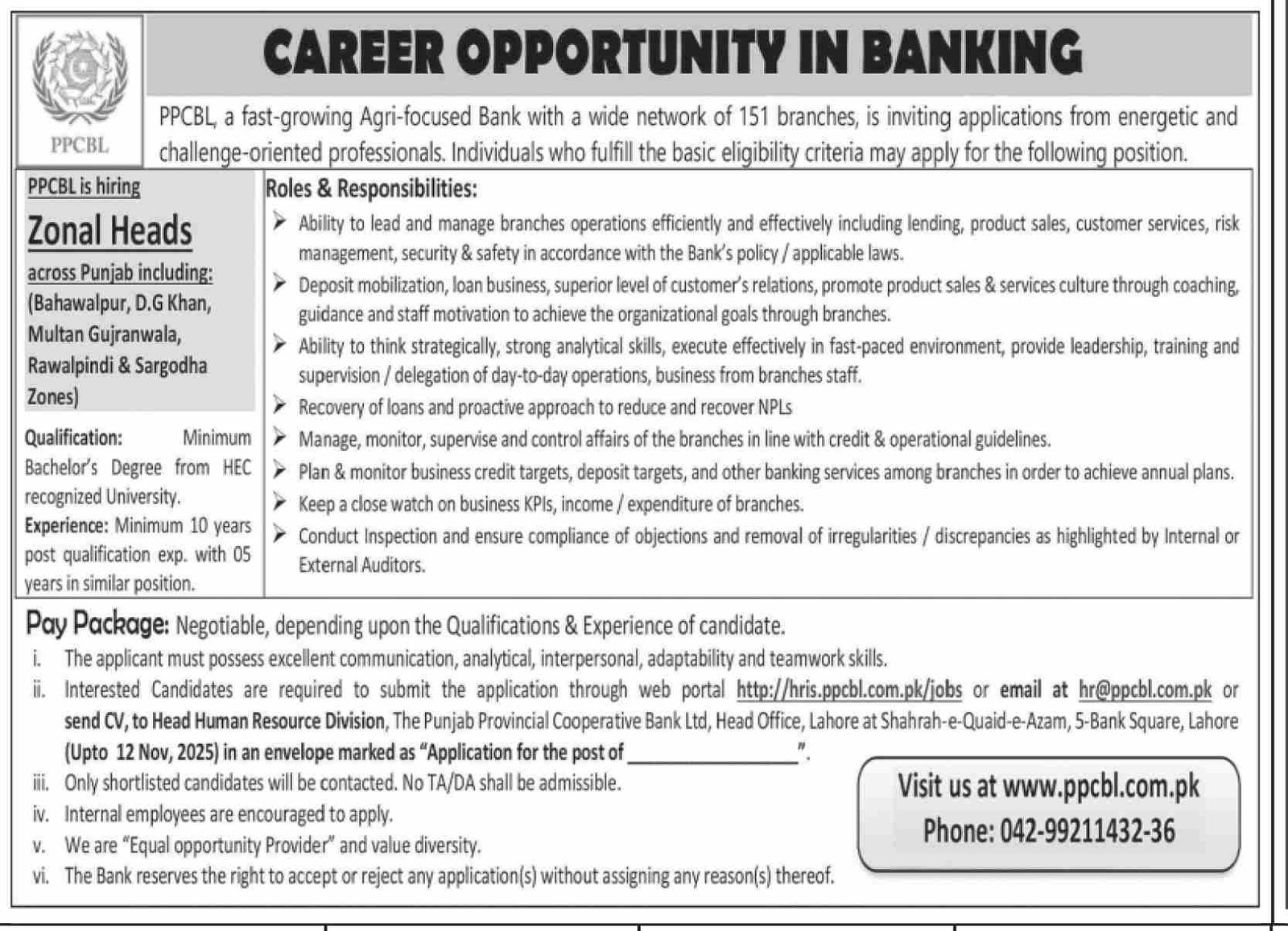 The Punjab Provincial Cooperative Bank Ltd Jobs 2025 announce the Contract career opportunities for the post of See Below Ad in Punjab, Lahore for the fresh and experienced candidates on Contract basis who have Check Advertisement degree. Posted date of this post is 02/11/2025 and the last date is 12/11/2025. if you are eligible for this job apply before due date.