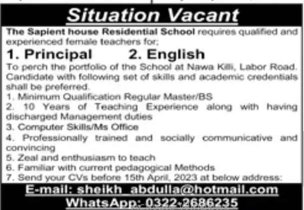 The Sapient House Residential School Jobs 2023 announce the Contract career opportunities for the post of See Below Ad in Balochistan, Quetta for the fresh and experienced candidates on Contract basis who have Check Advertisement degree. Posted date of this post is 10/04/2023 and the last date is 15/04/2023. if you are eligible for this job apply before due date.