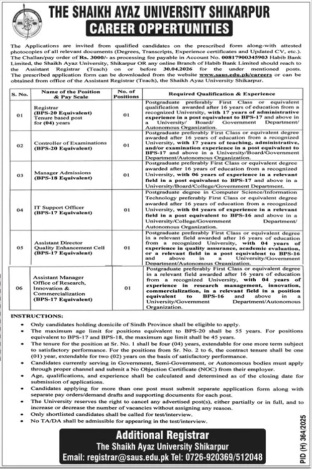 The Applications are invited from qualified candidates on the prescribed form along-with attested photocopies of all relevant documents (Degrees, Transcripts, Experience certificates and Updated CV, etc.). The Challan/pay order of Rs. 3000/- as processing fee payable in Account No. 00817900345903 Habib Bank Limited, the Shaikh Ayaz University, Shikarpur OR any online Branch of Habib Bank Limited should reach to the Assistant Registrar (Teach) on or before 30.04.2026 for the under mentioned posts. The prescribed application form can be downloaded from the website or can be obtained from office of the Assistant Registrar (Teach), the Shaikh Ayaz University Shikarpur.