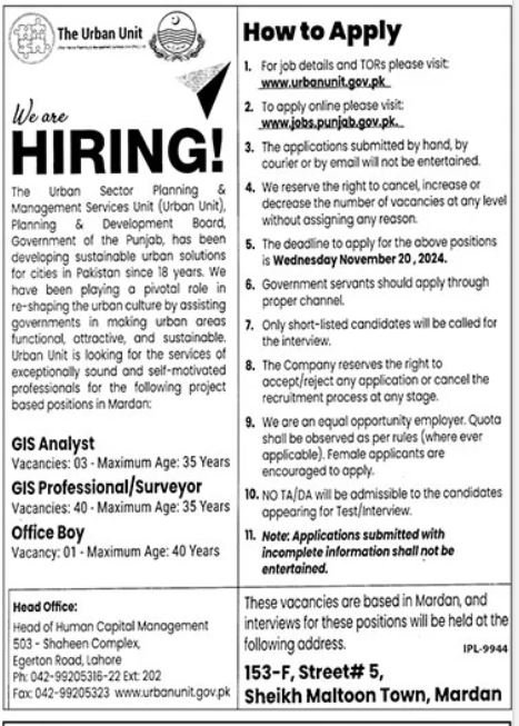The Urban Unit Lahore Punjab Jobs 2024 announce the Contract career opportunities for the post of See Below Ad in Punjab, Lahore for the fresh and experienced candidates on Contract basis who have Check Advertisement degree. Posted date of this post is 03/11/2024 and the last date is 20/11/2024. if you are eligible for this job apply before due date.
