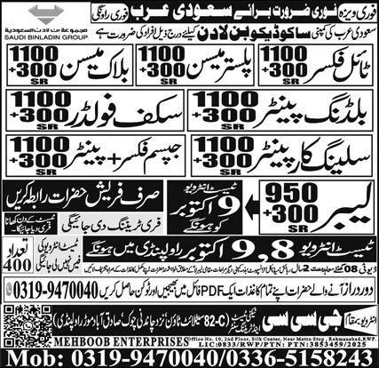 Tile Fixer And Block Mason Jobs in Saudia Arabia 2025 announce the Contract career opportunities for the post of See Below Ad in Saudi Arabia for the fresh and experienced candidates on Contract basis who have Check Advertisement degree. Posted date of this post is 08/10/2025 and the last date is 09/10/2025. if you are eligible for this job apply before due date.