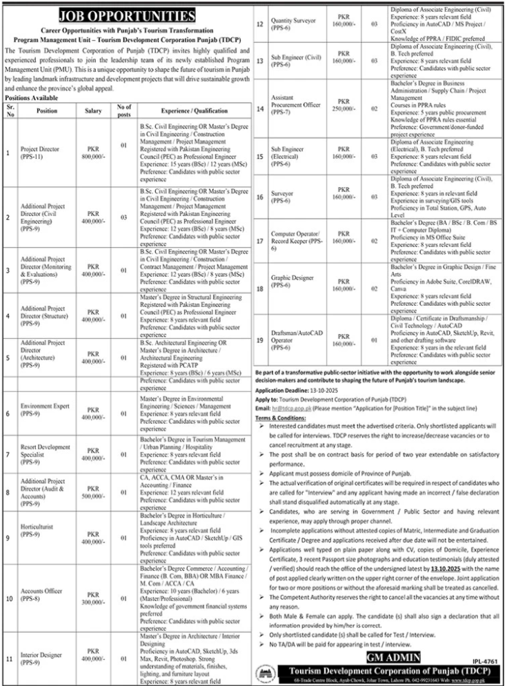 Tourism Development Corporation Of Punjab TDCP Jobs 2025 announce the Contract career opportunities for the post of See Below Ad in Punjab, Lahore for the fresh and experienced candidates on Contract basis who have Check Advertisement degree. Posted date of this post is 25/09/2025 and the last date is 13/10/2025. if you are eligible for this job apply before due date.