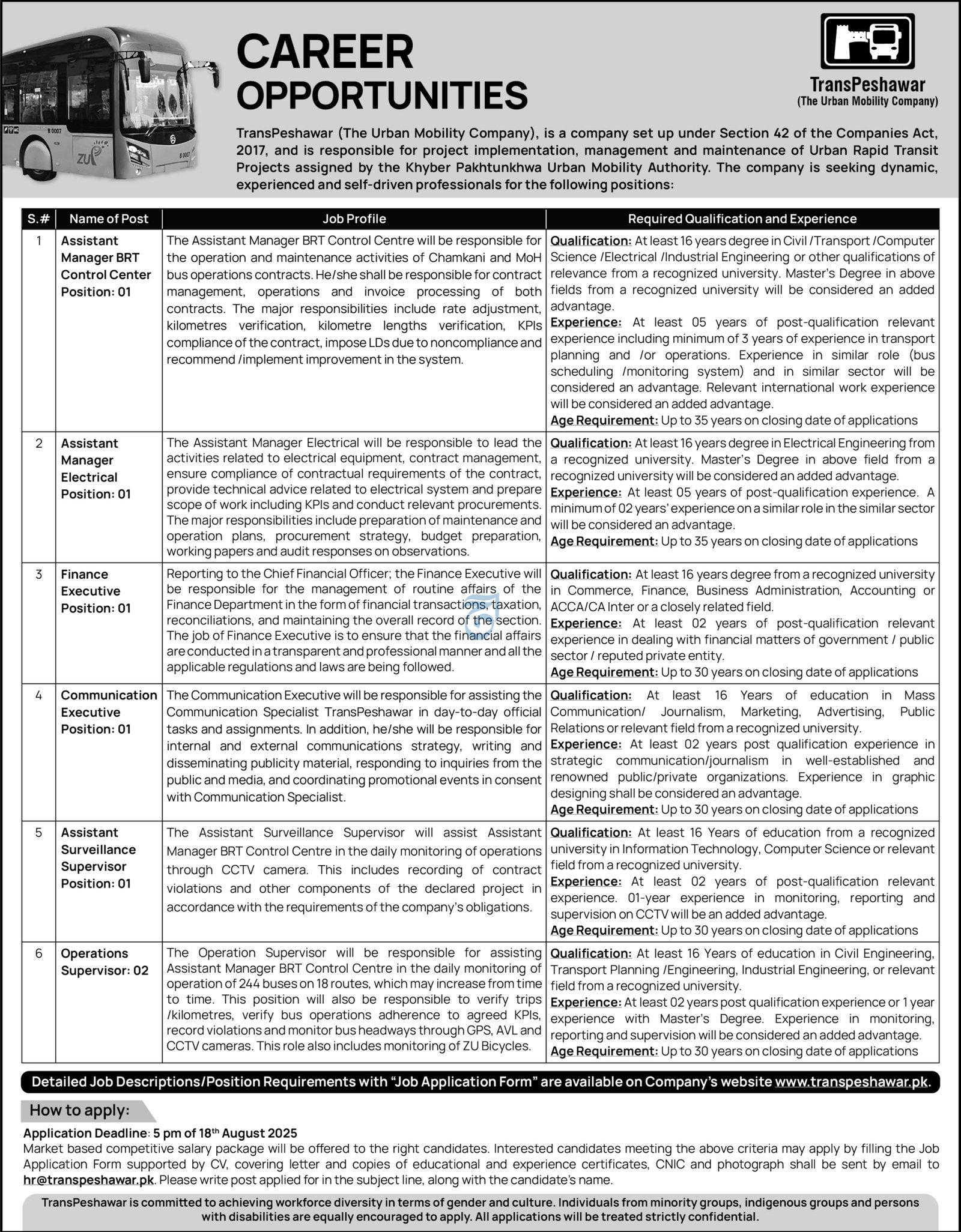 TransPeshawar Khyber Pakhtunkhwa Jobs 2025 announce the Contract career opportunities for the post of See Below Ad in Khyber Pakhtunkhwa, Peshawar for the fresh and experienced candidates on Contract basis who have Check Advertisement degree. Posted date of this post is 03/08/2025 and the last date is 18/08/2025. if you are eligible for this job apply before due date.