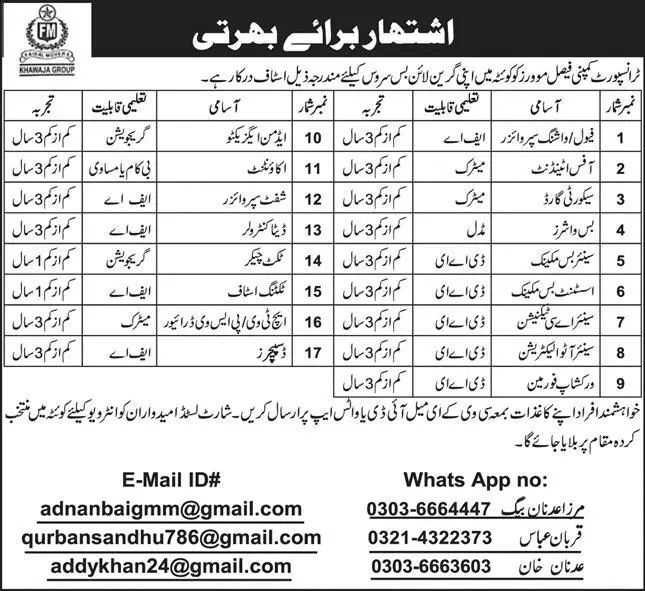 Transport Company Faisal Movers Quetta Jobs 2023 announce the Contract career opportunities for the post of See Below Ad in Balochistan, Quetta for the fresh and experienced candidates on Contract basis who have Check Advertisement degree. Posted date of this post is 09/07/2023 and the last date is 31/07/2023. if you are eligible for this job apply before due date.