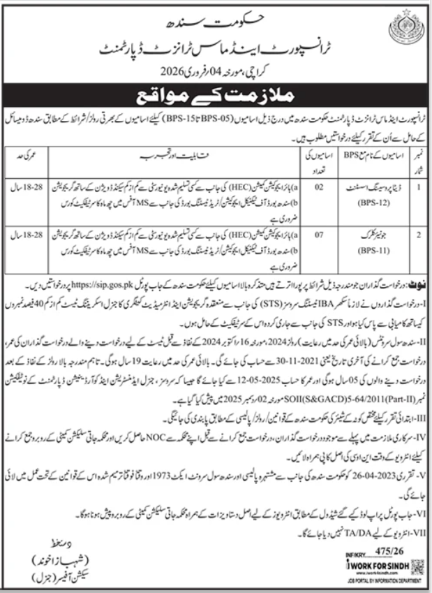 Transport & Mass Transit Department Karachi Jobs 2026 announce the Contract career opportunities for the post of See Below Ad in Sindh, Karachi for the fresh and experienced candidates on Contract basis who have Check Advertisement degree. Posted date of this post is 10/02/2026 and the last date is 25/02/2026. if you are eligible for this job apply before due date.