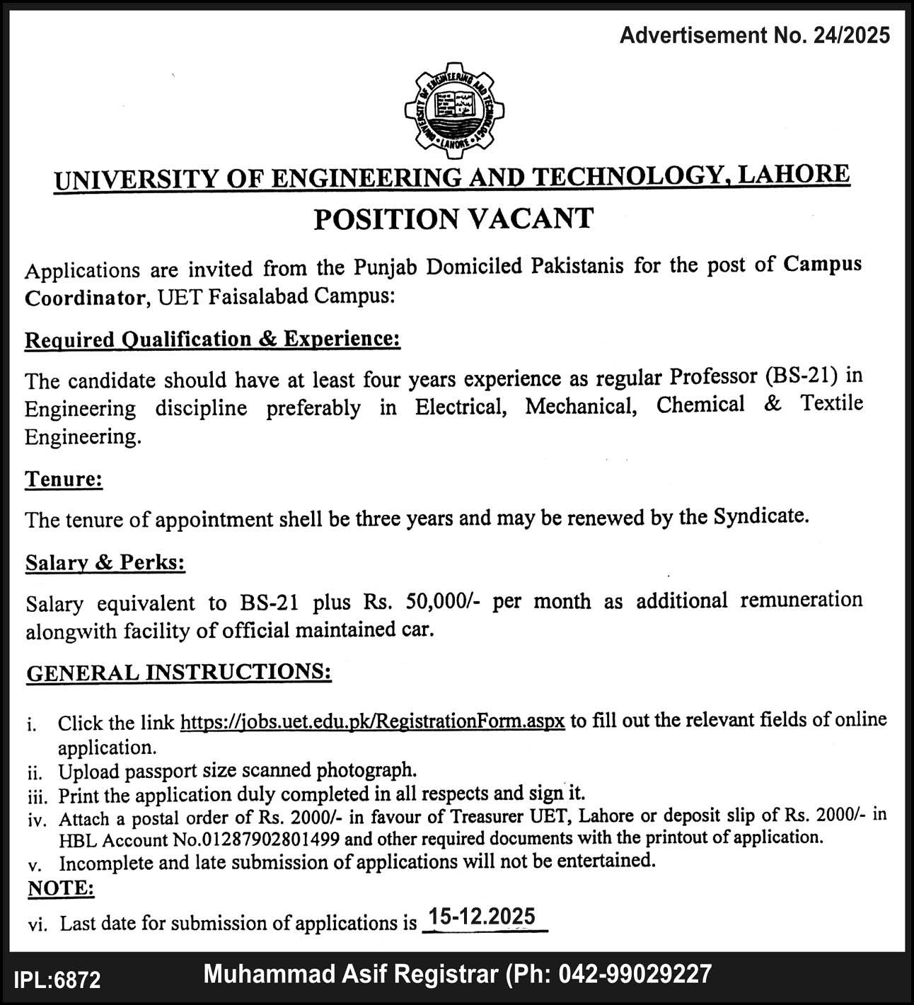 UET Faisalabad Campus Jobs 2025 For Campus Coordinator announce the Contract career opportunities for the post of See Below Ad in Punjab, Faisalabad for the fresh and experienced candidates on Contract basis who have Check Advertisement degree. Posted date of this post is 03/12/2025 and the last date is 15/12/2025. if you are eligible for this job apply before due date.