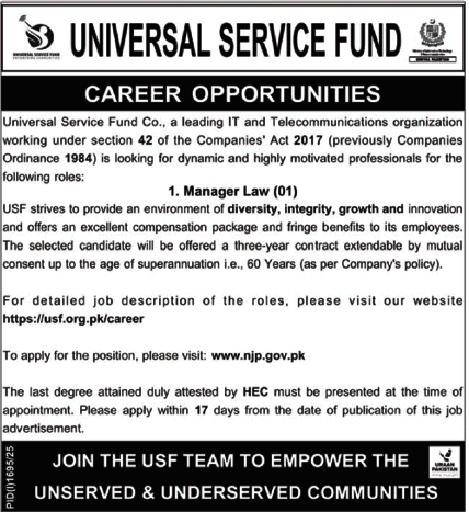 Universal Service Fund Co., a leading IT and Telecommunications organization working under section 42 of the Companies' Act 2017 (previously Companies Ordinance 1984) is looking for dynamic and highly motivated professionals for the following roles: