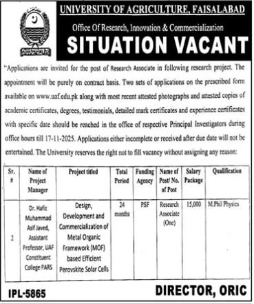 "Applications are invited for the post of Research Associate in following research project. The appointment will be purely on contract basis. Two sets of applications on the prescribed form available on along with most recent attested photographs and attested copies of academic certificates, degrees, testimonials, detailed mark certificates and experience certificates with specific date should be reached in the office of respective Principal Investigators during office hours till 17-11-2025. Applications either incomplete or received after due date will not be entertained. The University reserves the right not to fill vacancy without assigning any reason:"