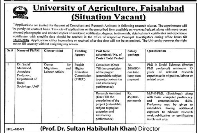 University of Agriculture Faislabad Jobs 2026 announce the Contract career opportunities for the post of See Below Ad in Punjab, Faisalabad for the fresh and experienced candidates on Contract basis who have Check Advertisement degree. Posted date of this post is 26/04/2026 and the last date is 14/05/2026. if you are eligible for this job apply before due date.