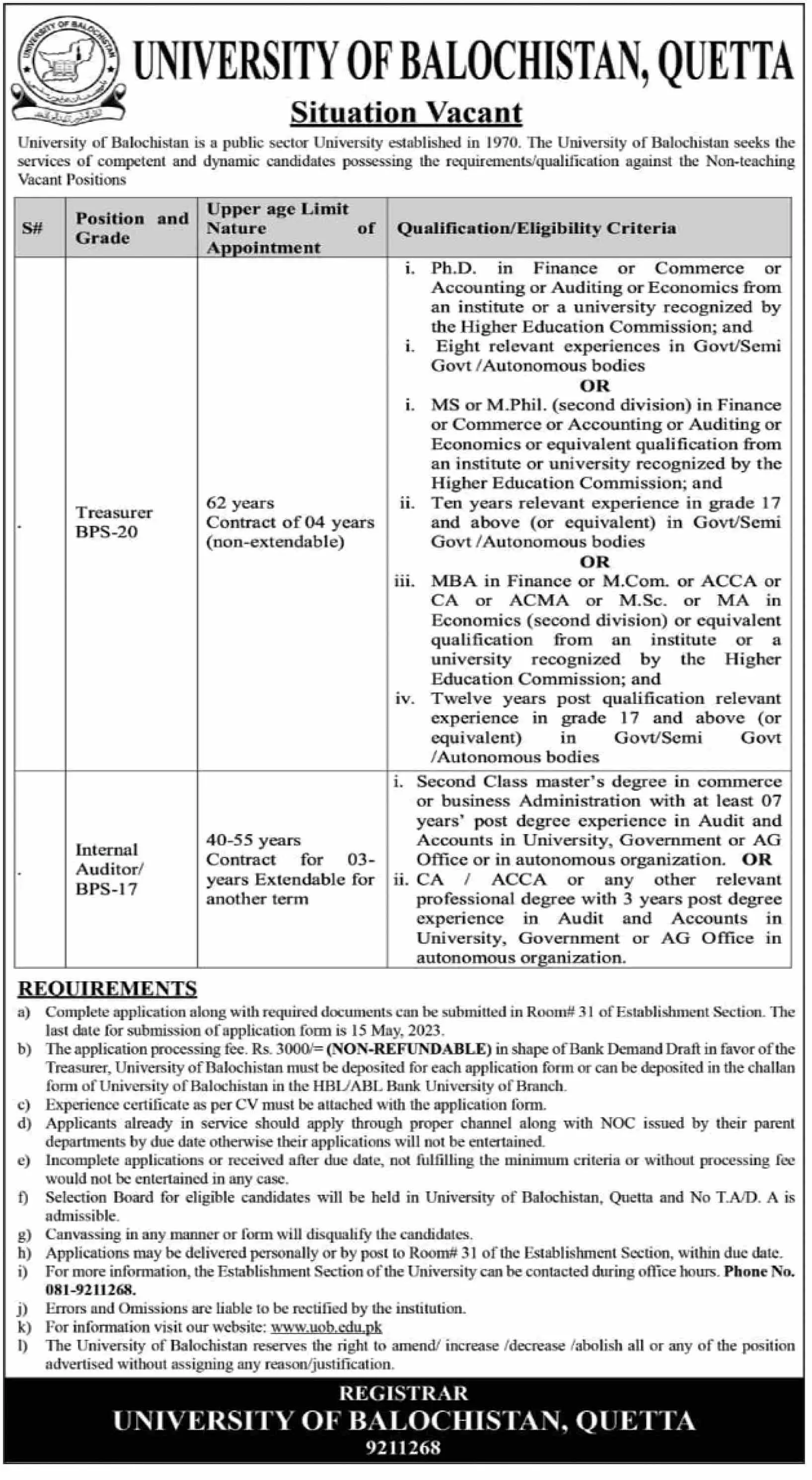 University of Balochistan Jobs 2023 announce the Contract career opportunities for the post of See Below Ad in Balochistan, Quetta for the fresh and experienced candidates on Contract basis who have Check Advertisement degree. Posted date of this post is 16/04/2023 and the last date is 15/05/2023. if you are eligible for this job apply before due date.