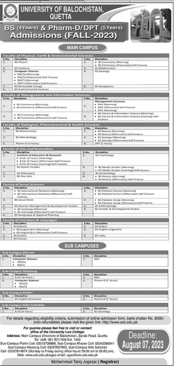 University of Balochistan Quetta Admissions 2023 announce the Contract career opportunities for the post of See Below Ad in Balochistan, Quetta for the fresh and experienced candidates on Contract basis who have Check Advertisement degree. Posted date of this post is 22/07/2023 and the last date is 07/08/2023. if you are eligible for this job apply before due date.