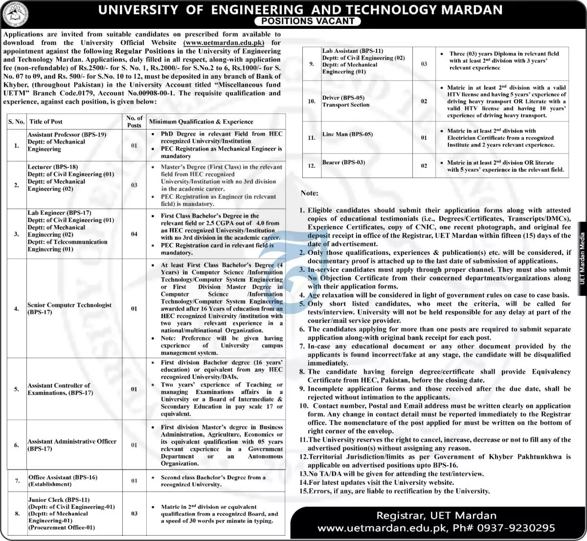 University of Engineering and Technology (UET), Mardan announce the Permanent career opportunities for the post of See Below Ad in Mardan for the fresh and experienced candidates on Permanent basis who have Check Advertisement degree. Posted date of this post is 06/03/2022 and the last date is 21/03/2022. if you are eligible for this job apply before due date.