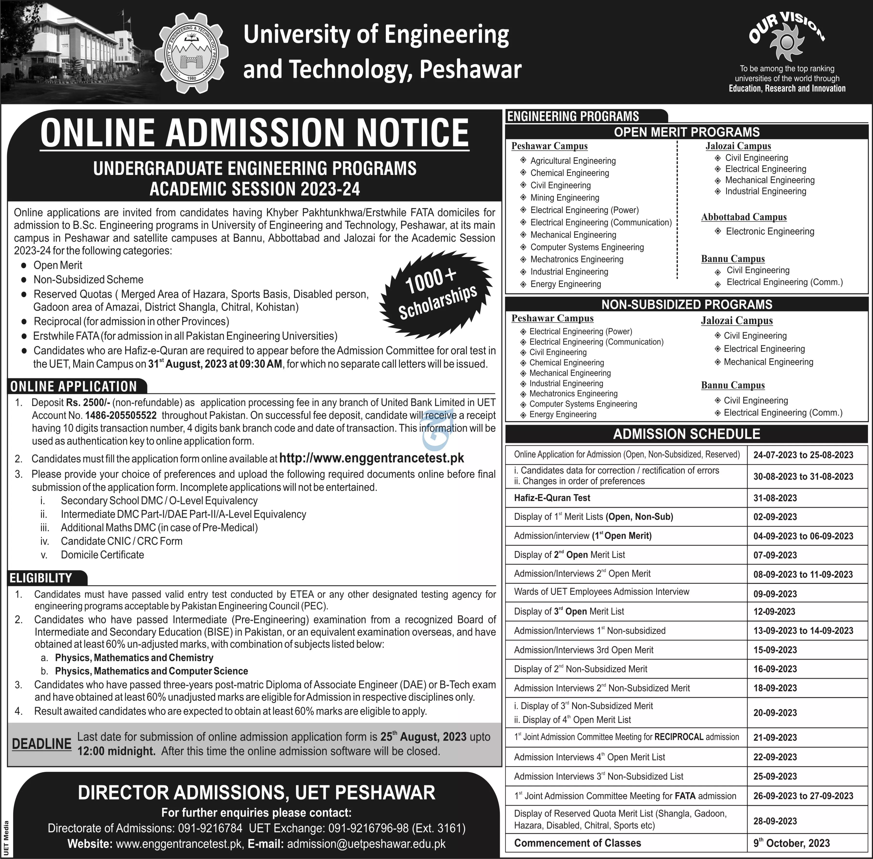 University of Engineering & Technology Peshawar Admissions announce the Contract career opportunities for the post of See Below Ad in Khyber Pakhtunkhwa, Peshawar for the fresh and experienced candidates on Contract basis who have Check Advertisement degree. Posted date of this post is 24/07/2023 and the last date is 25/08/2023. if you are eligible for this job apply before due date.