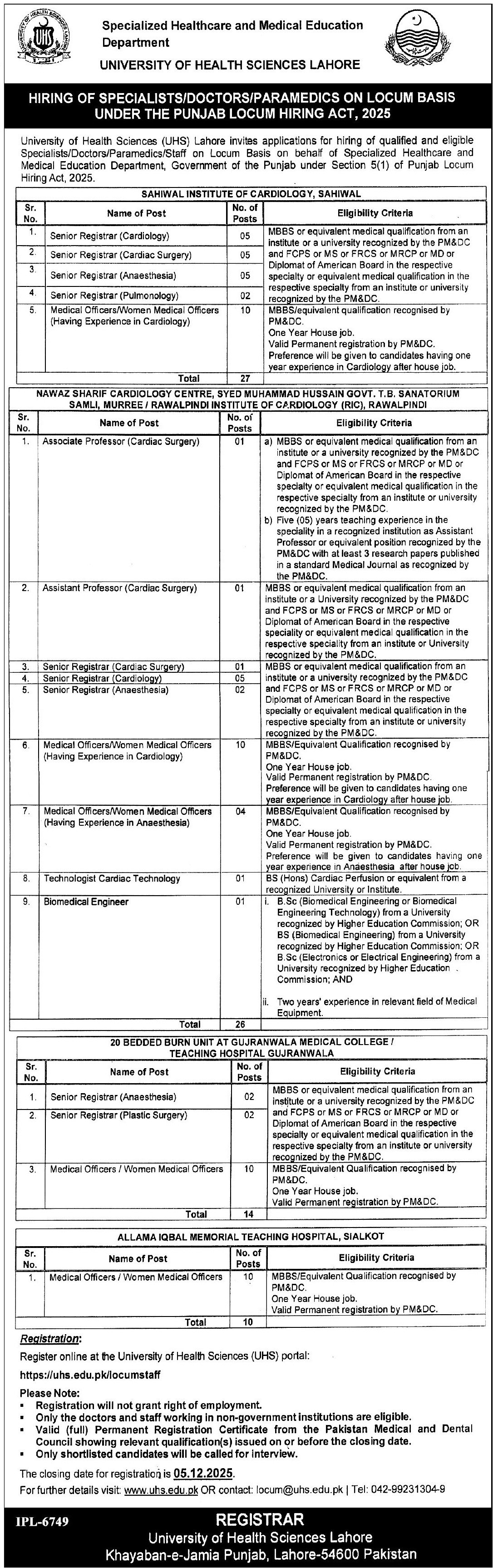 University of Health Sciences (UHS) Lahore invites applications for hiring of qualified and eligible Specialists/Doctors/Paramedics on Locum Basis on behalf of Specialized Healthcare and Medical Education Department, Government of the Punjab under Section 5(1) of Locum Hiring Act 2025.