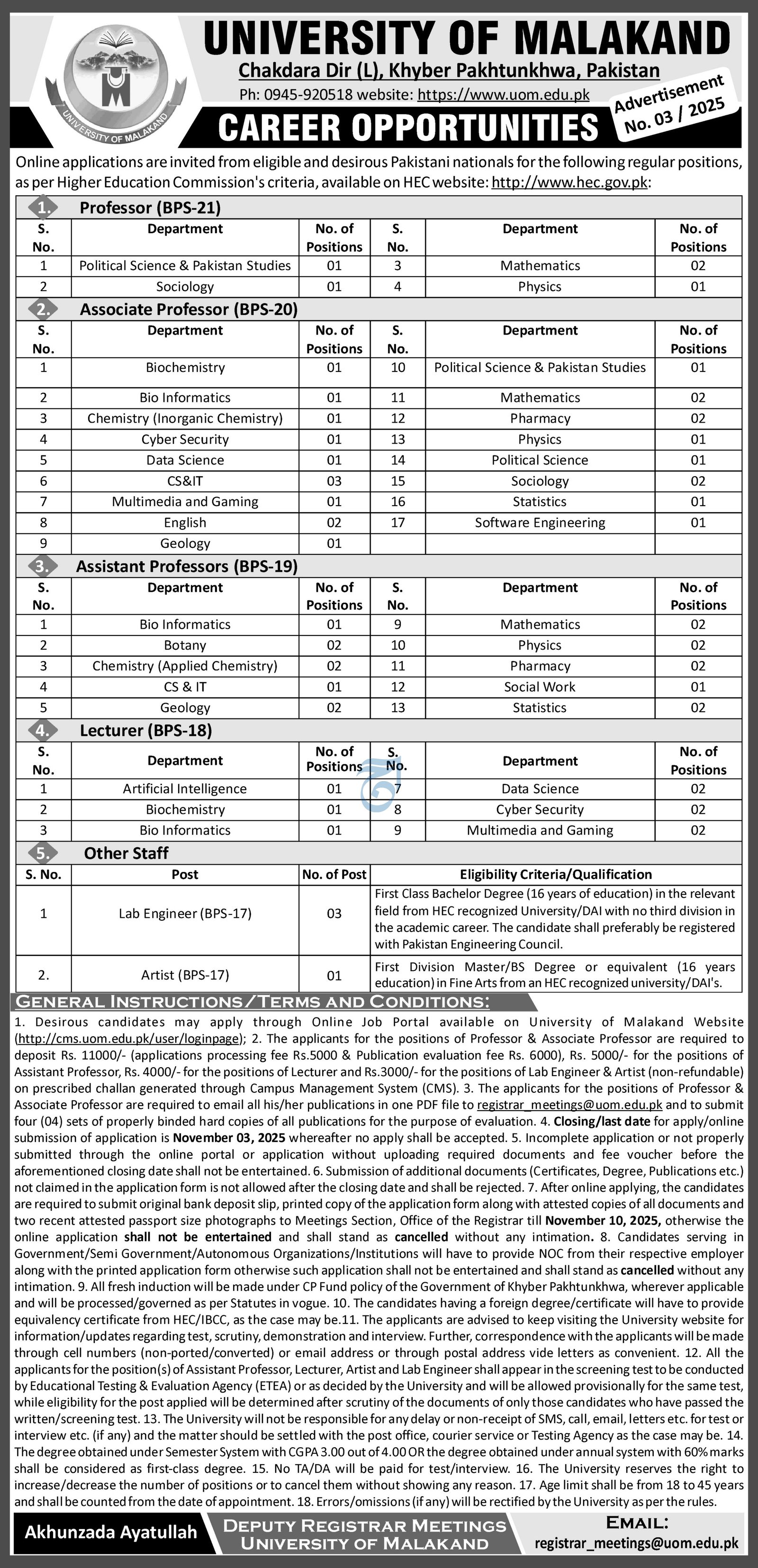 University of Malakand Lower Dir Jobs 2025 announce the Contract career opportunities for the post of See Below Ad in Khyber Pakhtunkhwa, Lower Dir for the fresh and experienced candidates on Contract basis who have Check Advertisement degree. Posted date of this post is 19/10/2025 and the last date is 03/11/2025. if you are eligible for this job apply before due date.