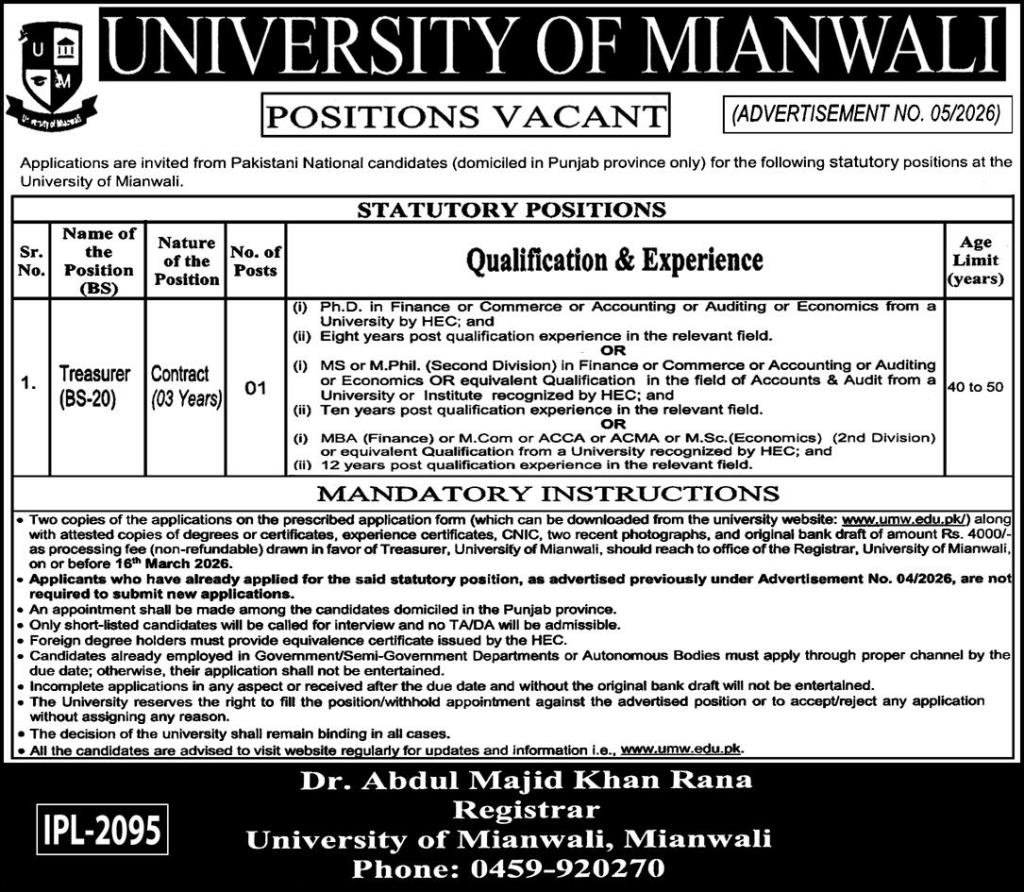 University Of Mianwali UMW Jobs 2026 For Treasurer announce the Contract career opportunities for the post of See Below Ad in Punjab, Mianwali for the fresh and experienced candidates on Contract basis who have Check Advertisement degree. Posted date of this post is 28/02/2026 and the last date is 16/03/2026. if you are eligible for this job apply before due date.