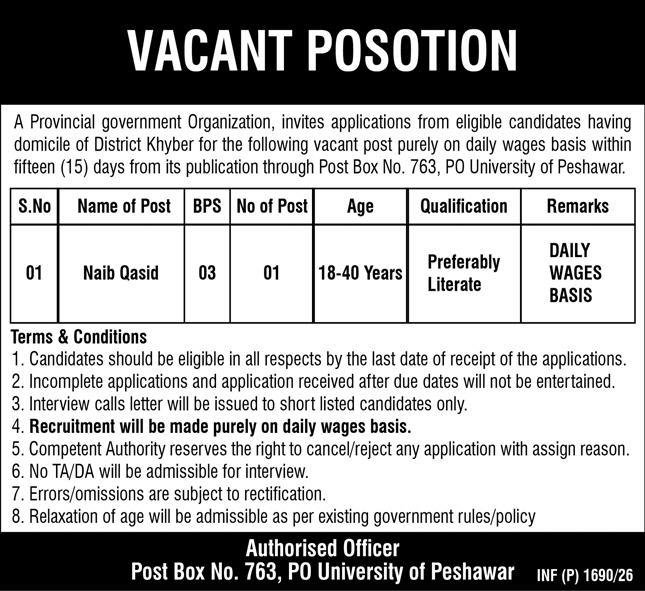 University Of Peshawar Jobs 2026 announce the Contract career opportunities for the post of See Below Ad in Khyber Pakhtunkhwa, Peshawar for the fresh and experienced candidates on Contract basis who have Check Advertisement degree. Posted date of this post is 17/04/2026 and the last date is 02/05/2026. if you are eligible for this job apply before due date.