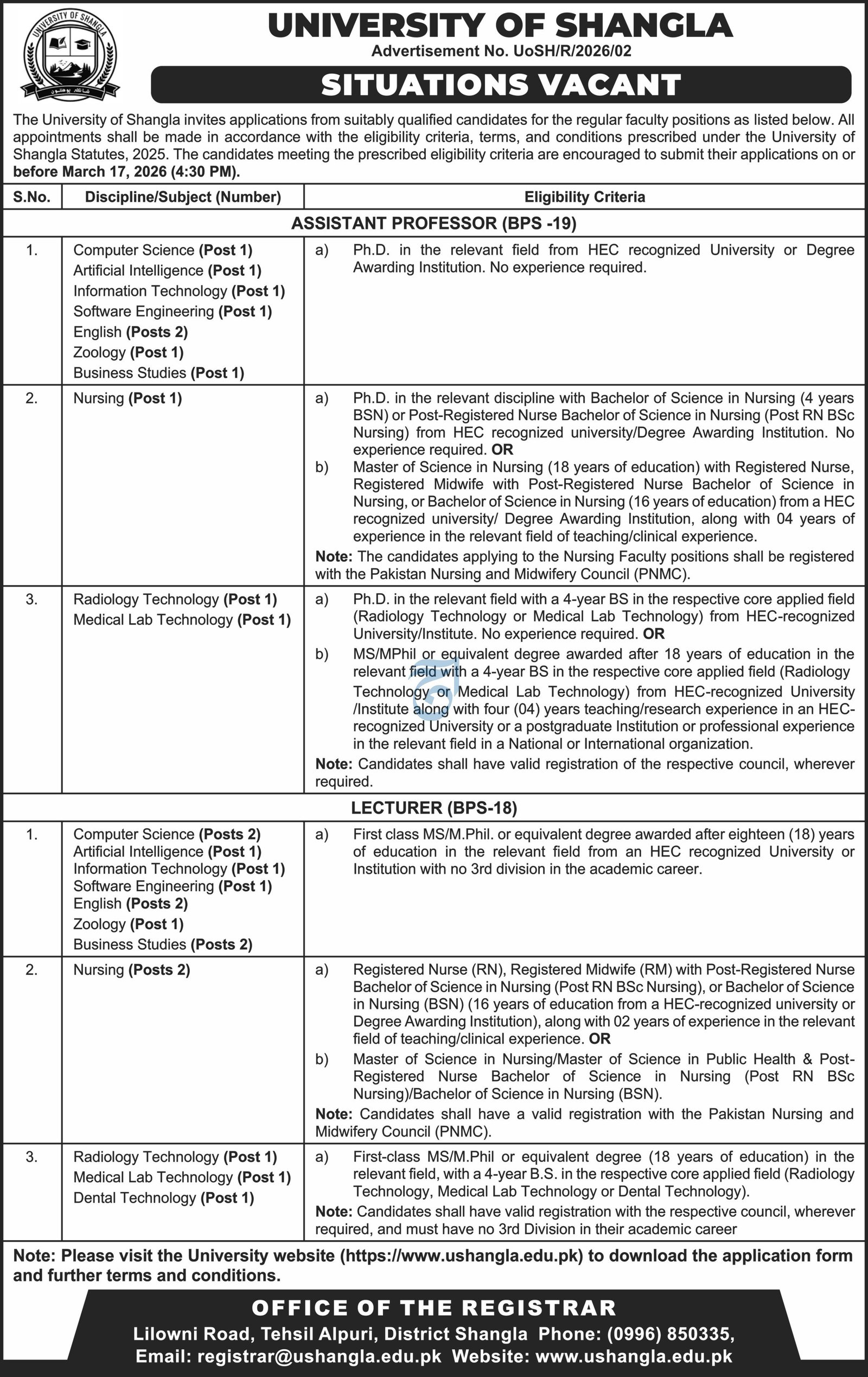 University of Shangla Punjab Jobs 2026 announce the Contract career opportunities for the post of See Below Ad in Punjab, Shangla for the fresh and experienced candidates on Contract basis who have Check Advertisement degree. Posted date of this post is 26/02/2026 and the last date is 13/03/2026. if you are eligible for this job apply before due date.