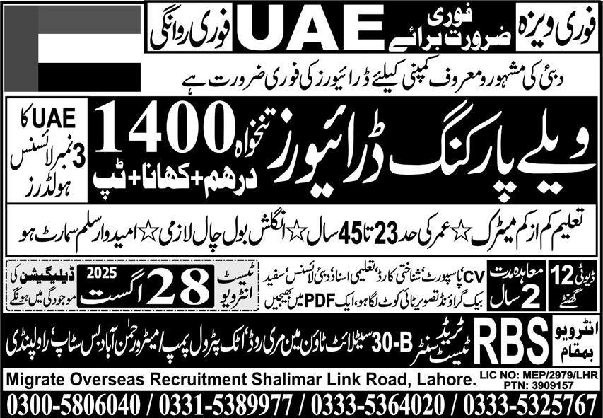 Valet Parking Driver & LTV Driver Jobs 2025 In UAE announce the Contract career opportunities for the post of See Below Ad in United Arab Emirates for the fresh and experienced candidates on Contract basis who have Check Advertisement degree. Posted date of this post is 27/08/2025 and the last date is 28/08/2025. if you are eligible for this job apply before due date.