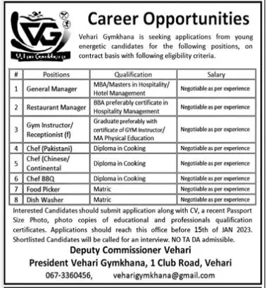 - Gymkhana Vehari, vehari Punjab Pakistan invites applications from eligible candidates for the post of chef, restaurant manager, gym instructor, receptionist, food picker, pakistani chef, chinese chef, chef bbq, continental chef, general manager and dish washer as per advertisement of January 5, 2023 published in daily Jang Newspaper. Preferred Education is Bachelor, Intermediate, Matric, MBA, Master and BBA etc.