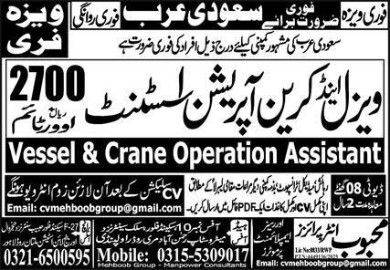 Vessel & Crane Operation Assistant Jobs 2026 In Saudi Arabia announce the Contract career opportunities for the post of See Below Ad in Saudi Arabia for the fresh and experienced candidates on Contract basis who have Check Advertisement degree. Posted date of this post is 22/01/2026 and the last date is 29/01/2026. if you are eligible for this job apply before due date.