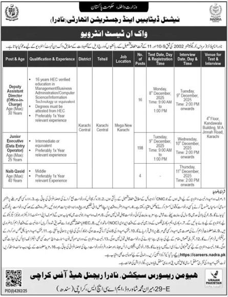 Walk In Test And Interviews At NADRA 2025 announce the Contract career opportunities for the post of See Below Ad in Federal, Islamabad for the fresh and experienced candidates on Contract basis who have Check Advertisement degree. Posted date of this post is 23/11/2025 and the last date is 12/12/2025. if you are eligible for this job apply before due date.