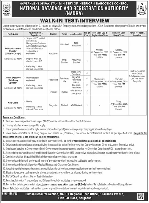 PID(I)4302/25 Human Resource Section, NADRA Regional Head Office, 6-Gulshan Avenue, Link PAF Road, Sargodha.