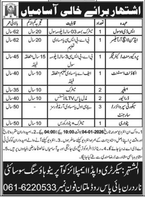 Wapda Employees Cooperative Housing Society Multan Jobs announce the Contract career opportunities for the post of See Below Ad in Punjab, Multan for the fresh and experienced candidates on Contract basis who have Check Advertisement degree. Posted date of this post is 31/12/2025 and the last date is 04/01/2026. if you are eligible for this job apply before due date.