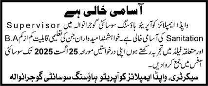 In WAPDA Employees Cooperative Housing Society Gujranwala, a vacancy for Sanitation Supervisor is available. Interested candidates with a minimum educational qualification of B.A and experience in the relevant field should submit their applications to the Society office by August 25, 2025.