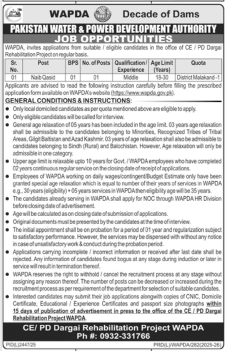 • Interested candidates may submit their job applications along with copies of CNIC, Domicile Certificate, Educational/Experience Certificates, and passport-size photographs within 15 days of the publication of this advertisement to the office of the CE / PD Dargai Rehabilitation Project WAPDA.