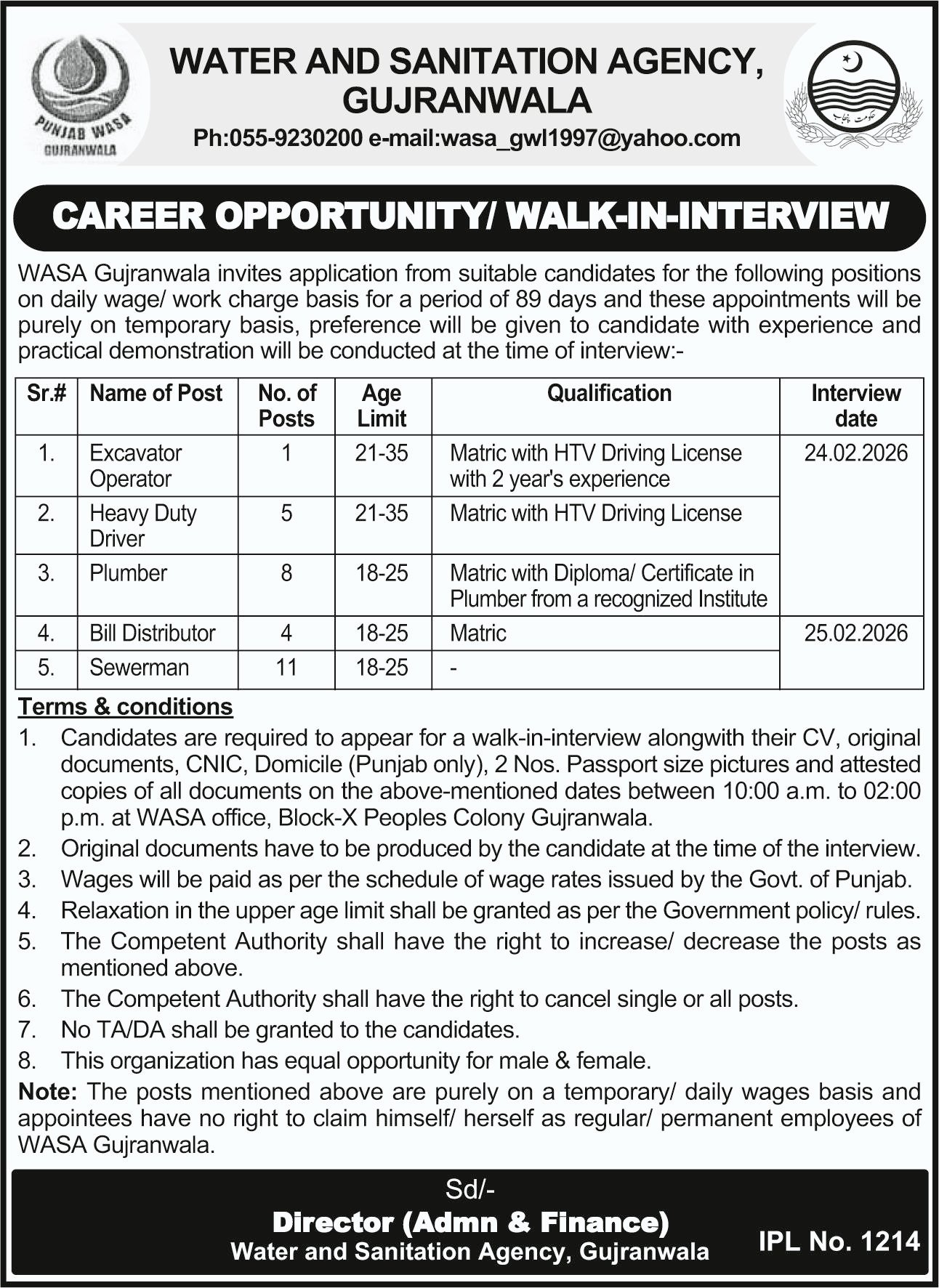 WASA Gujranwala invites application from suitable candidates for the following positions on daily wage/ work charge basis for a period of 89 days and these appointments will be purely on temporary basis, preference will be given to candidate with experience and practical demonstration will be conducted at the time of interview:-