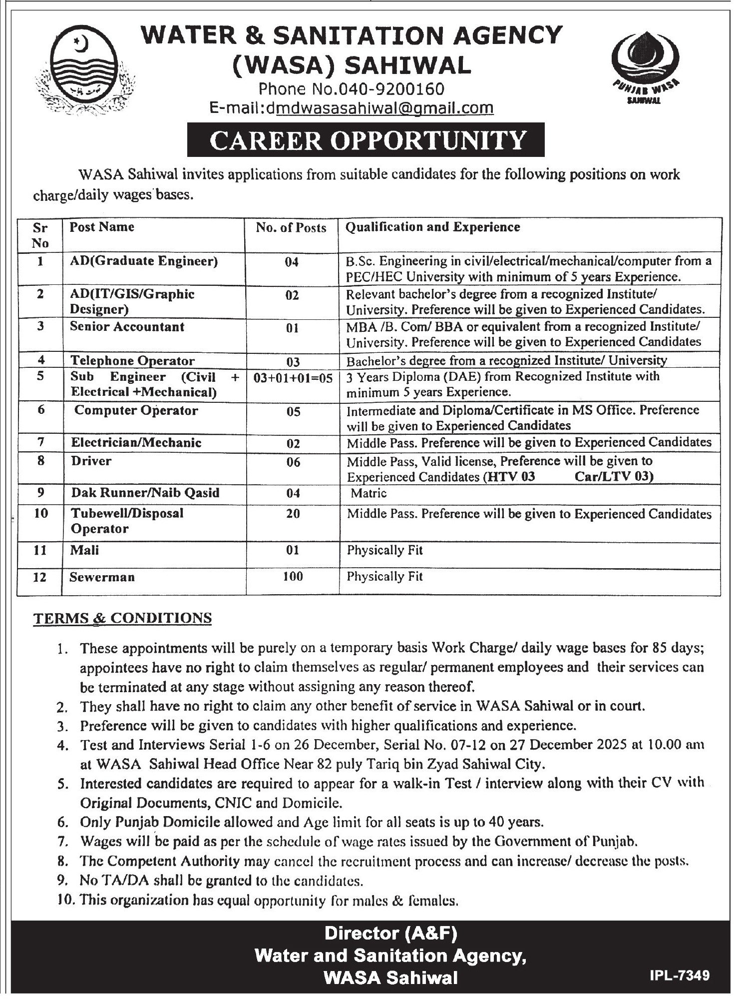 Water And Sanitation Agency WASA Punjab Jobs 2025 announce the Contract career opportunities for the post of See Below Ad in Punjab, Lahore for the fresh and experienced candidates on Contract basis who have Check Advertisement degree. Posted date of this post is 13/12/2025 and the last date is 28/12/2025. if you are eligible for this job apply before due date.