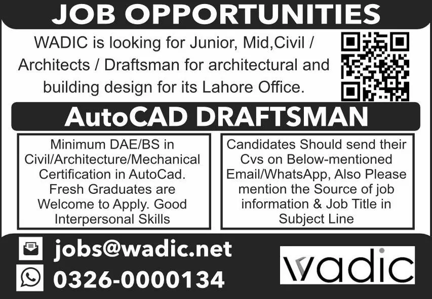 - WADIC is looking for Junior, Mid, Civil / Architects / Draftsman for architectural and building design for its Lahore Office. AutoCAD DRAFTSMAN