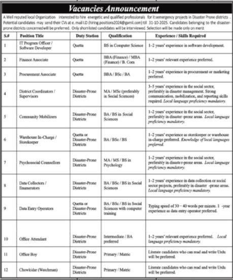 Wel Reputed Local Organization Quetta Jobs 2025 announce the Contract career opportunities for the post of See Below Ad in Balochistan, Quetta for the fresh and experienced candidates on Contract basis who have Check Advertisement degree. Posted date of this post is 22/10/2025 and the last date is 31/10/2025. if you are eligible for this job apply before due date.