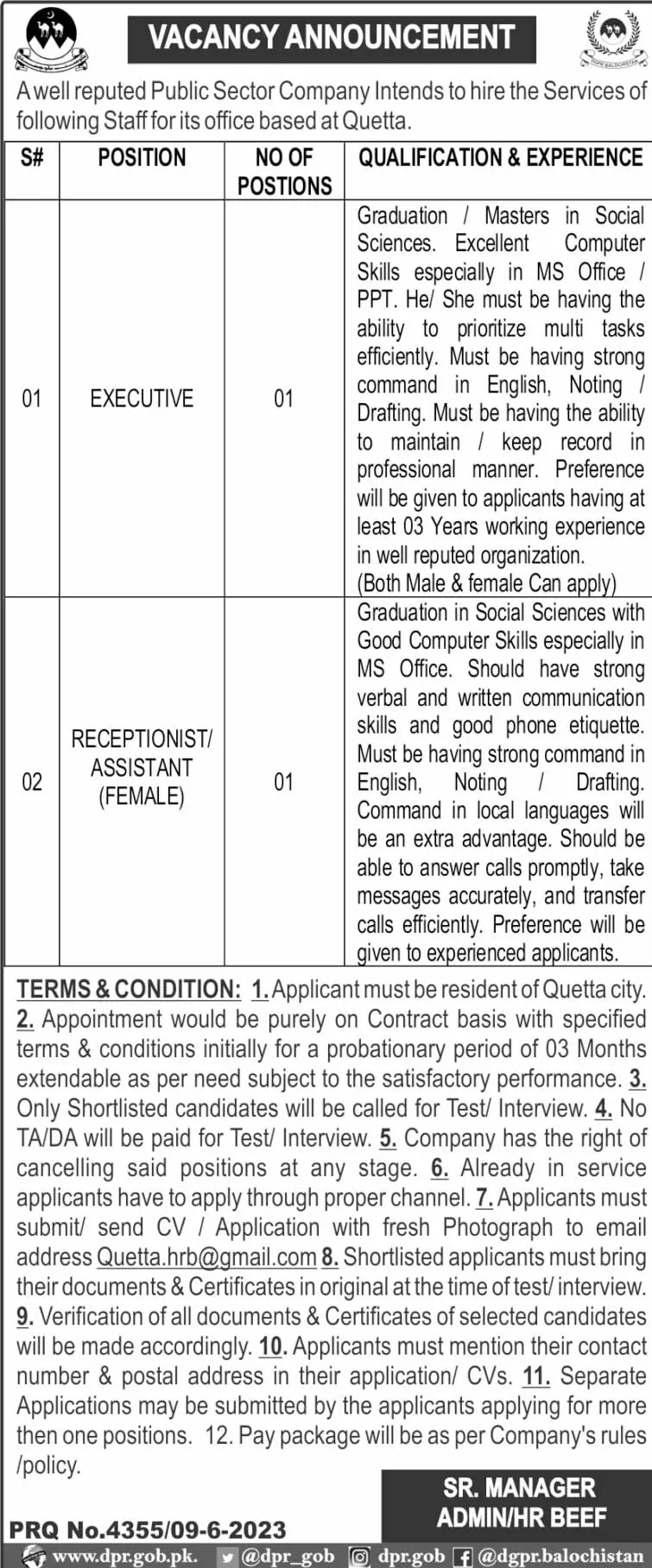 Well Reputed Public Sector Company Quetta Jobs 2023