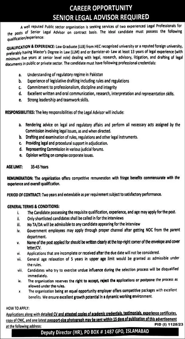 Well Reputed Public Sector Organization Islamabad Jobs 2023 announce the Contract career opportunities for the post of See Below Ad in Federal, Islamabad for the fresh and experienced candidates on Contract basis who have Check Advertisement degree. Posted date of this post is 21/08/2023 and the last date is 05/09/2023. if you are eligible for this job apply before due date.
