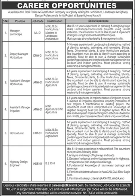 - Real Estate & Construction Company is looking for candidates for following posts as per job advertisement published in daily Jang Newspaper of December 18, 2022 for location Karachi, karachi Sindh Pakistan: