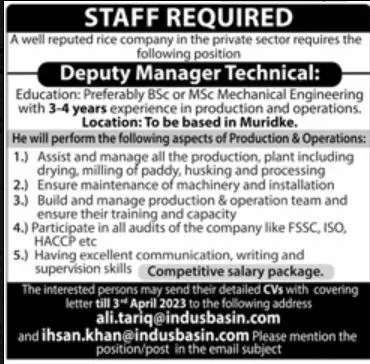- Latest Private jobs in Rice Mill in Engineering and others can be applied till 3 April 2023 or as per closing date in newspaper ad.