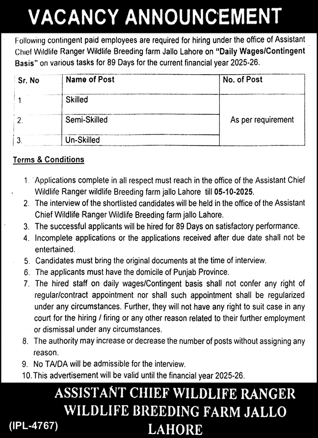 Wildlife Breeding Farm Lahore JObs 2025 announce the Contract career opportunities for the post of See Below Ad in Punjab, Lahore for the fresh and experienced candidates on Contract basis who have Check Advertisement degree. Posted date of this post is 25/09/2025 and the last date is 05/10/2025. if you are eligible for this job apply before due date.