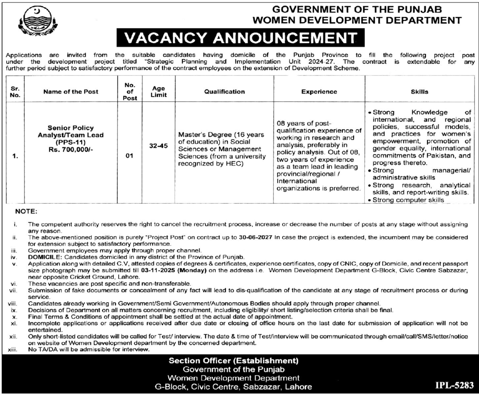 v. Application along with detailed C.V, attested copies of degrees & certificates, experience certificates, copy of CNIC, copy of Domicile, and recent passport size photograph may be submitted till 03-11-2025 (Monday) on the address i.e. Women Development Department G-Block, Civic Centre Sabzazar, near opposite Cricket Ground, Lahore.