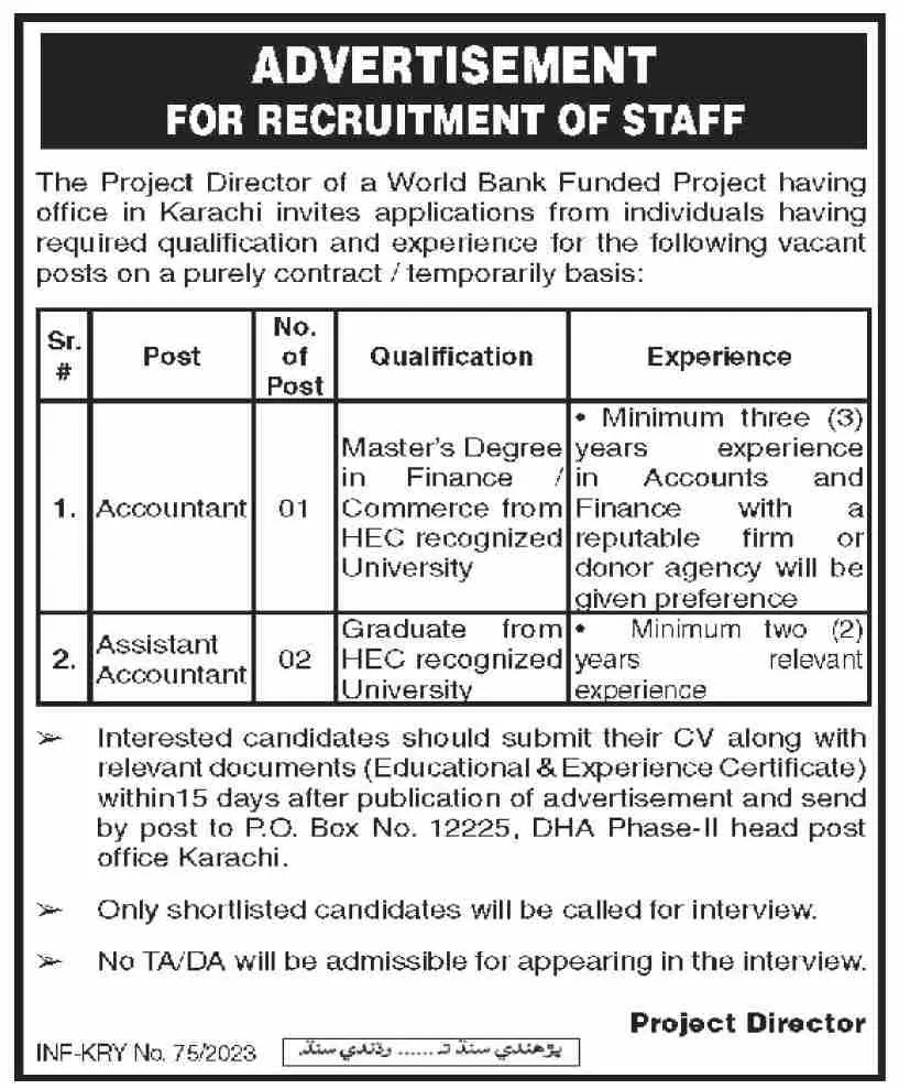 World Bank Funded Project Jobs 2023 announce the Contract career opportunities for the post of See Below Ad in Sindh, Karachi for the fresh and experienced candidates on Contract basis who have Check Advertisement degree. Posted date of this post is 12/01/2023 and the last date is 28/01/2023. if you are eligible for this job apply before due date.